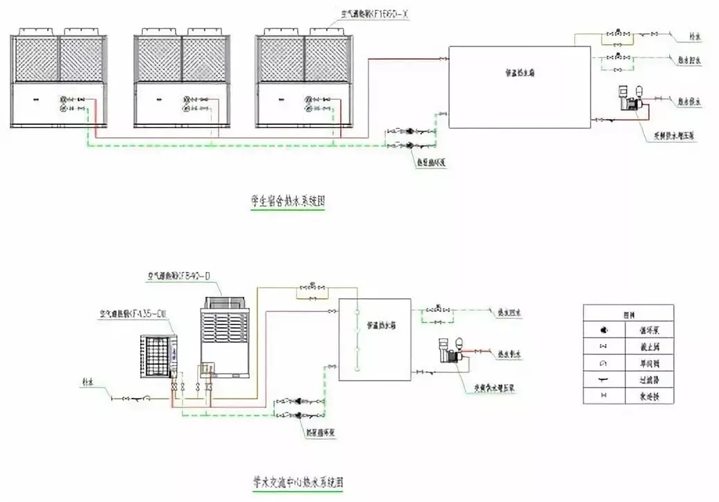本項目為福建省某中學洗浴熱水項目,共有2個熱水需求點:宿舍樓一棟共129間宿舍,學術交流中心一棟共80間客房,共配置3臺20匹循環式空氣源熱泵熱水器,10匹和5匹直熱式空氣源熱水器各1臺。