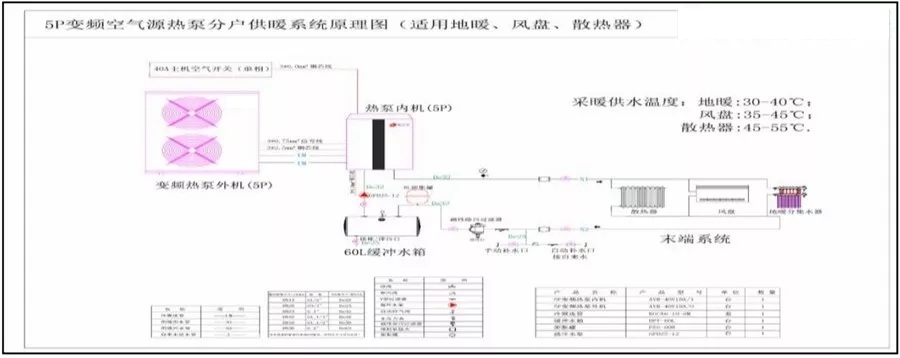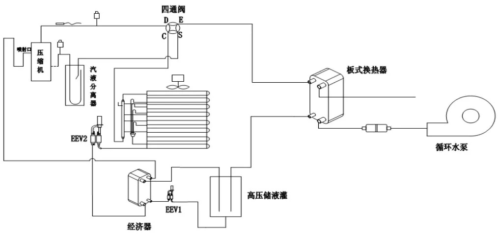 由上表可知北京延慶地區(qū)120平方米的農(nóng)村居民常用戶型采暖所需熱負(fù)荷約為7.5KW,室外環(huán)境溫度為-12℃時(shí),其制熱量約為8.65KWd的EVI變頻變水溫機(jī)組,額定制熱輸入功率為3.73KW,冬季可在-25℃的環(huán)境中正常供暖,確保山區(qū)農(nóng)戶冬季采暖需求。系統(tǒng)原理圖: