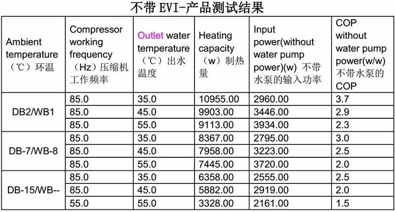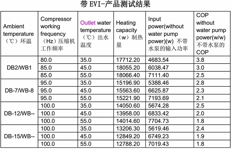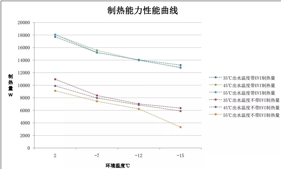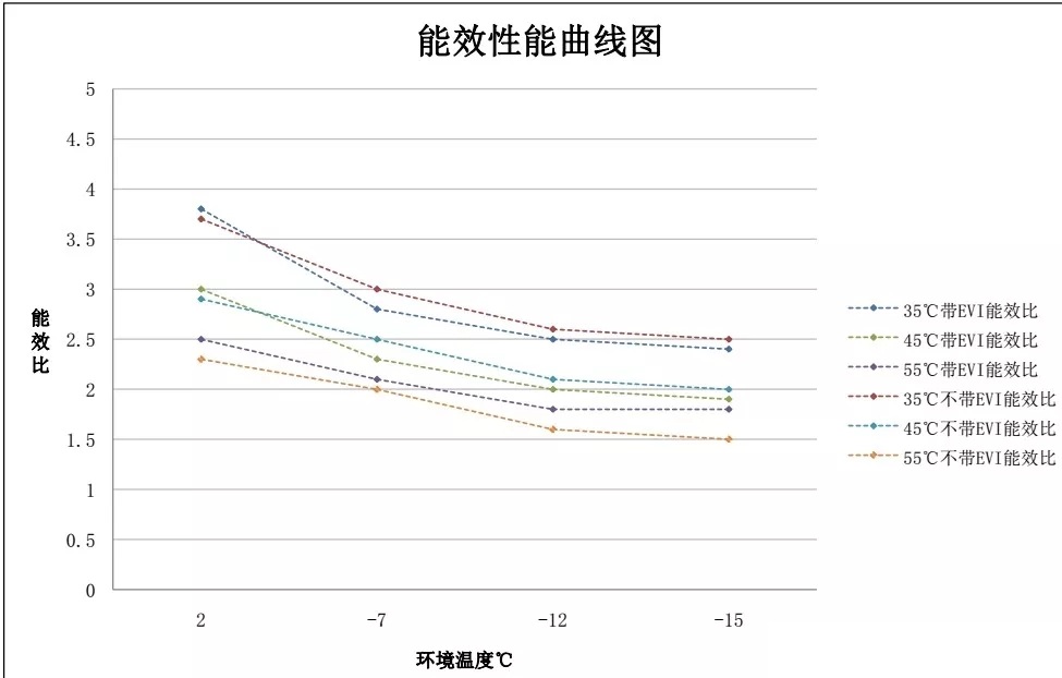說明EVI技對(duì)低環(huán)溫下高水溫供熱,無論從能力上還是效率上都有很大幫助;
