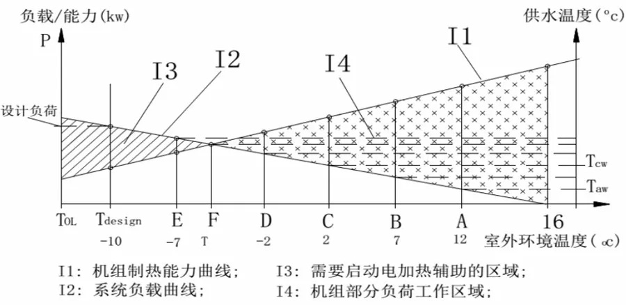 在熱泵供暖系統(tǒng)里面,調(diào)節(jié)供水溫度是最有效率的控制方式,如上節(jié)中所舉的臺(tái)機(jī)器的試驗(yàn)參數(shù)所顯示的,供水溫度對(duì)熱泵的COP有明顯影響,供水溫度越高,COP越低,從上面的數(shù)據(jù)看,溫度每升高1度,COP下降約2%;下圖,是空氣源熱泵制熱能力和建筑物所需負(fù)載在不同環(huán)溫下,對(duì)比變化的一對(duì)交叉曲線,在80%以上的時(shí)間,機(jī)組工作在部分負(fù)荷狀態(tài),變頻變水溫機(jī)組,在如下幾個(gè)因素上,能大幅提高機(jī)器的綜和季節(jié)能效比SCOP: