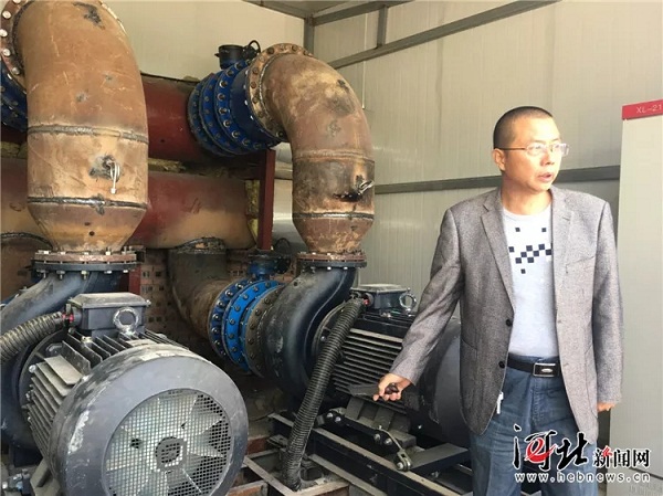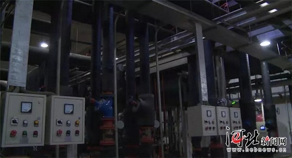 24日上午9時30分左右,在河北某大學的校園內操場附近,一處鐵絲網圍起來的區域內,沿著通往地下室的樓梯進入污水源熱泵機房,一排排大型的灰色的管道和控制箱赫然入目。
