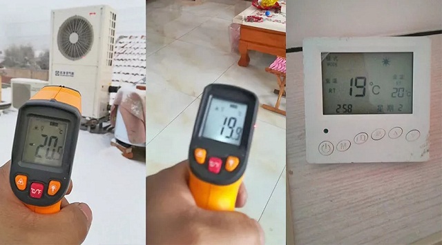 外界環(huán)境溫度—20.9℃,采用空氣源熱泵供暖,室內(nèi)地暖19.9℃