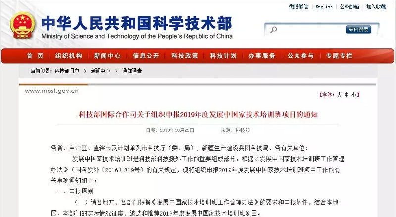 2018年9月30日,科技部國際合作司印發了《關于組織申報2019年度發展中國家技術培訓班項目的通知》,指出申報重點技術領域:2019年度發展中國家技術培訓班項目擬以成熟適用技術為主體,兼顧高新技術、科技政策與管理三類項目進行支持。申報領域以農林業、新能源與可再生能源、加工制造等領域為重點。