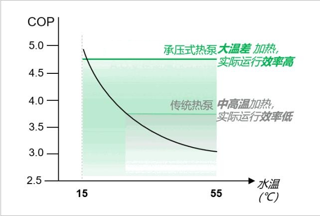承壓式熱泵熱水機組利用逆卡諾循環(huán)原理,通過采用大溫差換熱,充分利用空氣中的大量熱量,提供數(shù)倍于所消耗電能的熱量,COP最高達4.59,與傳統(tǒng)熱泵相比,運行費用更低。