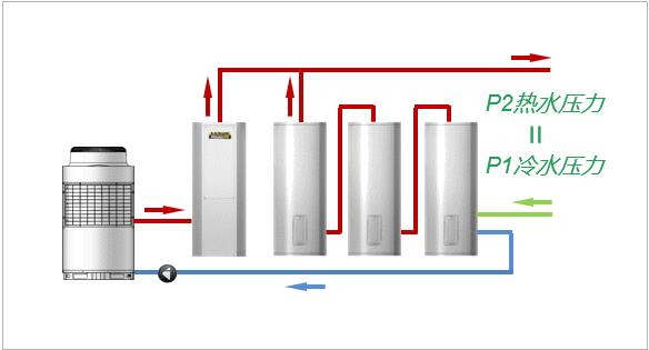非承壓系統(tǒng),熱水由增壓泵提供壓力,冷水由市政管網(wǎng)提供壓力,冷、熱水壓力不同源無法保持平衡,并且開式水箱頂部補水,易造成水箱內冷熱水混合,末端用水忽冷忽熱。
