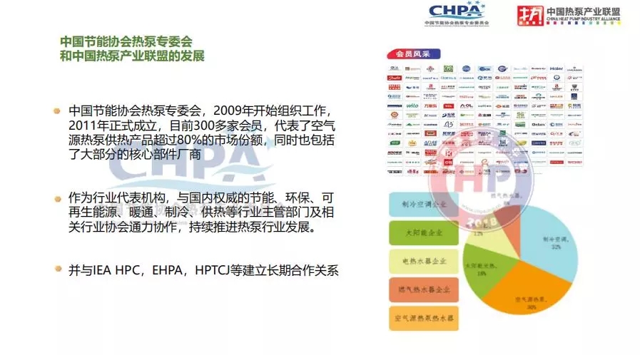 中國熱泵產業聯盟于2009年開始在我國熱泵行業組織與空氣源熱泵產業相關的工作,2014年8月正式通過民政部批準,注冊為中國節能協會熱泵專委會,是中國節能協會下設分支機構之一。目前協會具有300多家會員,代表了空氣源熱泵供熱產品超過80%的市場份額,同時也包括了大部分核心部件廠商。中國節能協會熱泵專業委員會作為行業代表機構,與國內權威的節能、環保、可再生能源、暖通、制冷、供熱等行業政府主管部門及相關行業協會通力協作,持續推進熱泵行業的發展。與此同時,專委會還與IEA HPC、EHPA、HPTCJ等國際產業機構建立長期合作關系。
