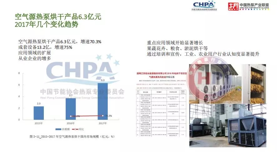 此外,近兩年生活熱水、供暖和工農業烘干三大應用領域在市場總量中所占的市場份額也發生變化。在供暖市場興起前,生活熱水一直占據年度產業總體規模的最大市場份額,但是2017年空氣源熱泵供暖(包括戶式和商用)產值達到90.4億元,占行業比例達到52.8%,開始占據最大份額。在空氣源熱泵供熱產品應用領域增幅方面也出現了變化,2017年生活熱水增幅最小為2.9%,供暖增長達到221.7%,烘干達到70.3%。2017年工農業烘干主機出貨額是6.3億,增速70.3%,成套設備算上烘房,成套設備市場規模實現13.2億,增速75%。此外烘干市場出現應用領域的擴展,從業企業的增多的特點。一些重點應用領域開始顯著增長,包括花卉、糧食、以及玉米烘干等。行業協會也正積極通過持續宣傳培訓來提升工業和農業用戶對于空氣源熱泵的認知度。