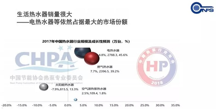 下面介紹一下國內(nèi)外相關(guān)標(biāo)準(zhǔn),據(jù)統(tǒng)計,我國建筑能耗約占全社會能耗總量的25%,建筑生活熱水和供暖占建筑能耗總量的約60%,所以說,熱水和供暖設(shè)備的節(jié)能潛力非常巨大。據(jù)產(chǎn)業(yè)在線統(tǒng)計報告顯示,我國生活熱水器銷量非常大。2017年電熱水器銷售2788.3萬臺,占熱水器銷量的45.6%,燃?xì)鉄崴饔?7.7%的增長,空氣源熱泵熱水器有2.5%的增長,銷售109.4萬臺,占比1.8%。