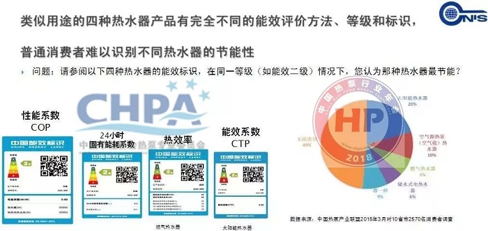 依據(jù)國家能效標(biāo)準(zhǔn),我國已經(jīng)實施了燃?xì)鉄崴鳌㈦姛崴鳌⑻柲軣崴骱蜔岜脽崴鞯哪苄?biāo)識,但類似用途的四種熱水器產(chǎn)品有完全不同的能效評價方法、等級和標(biāo)識,普通消費(fèi)者難以識別不同熱水器的節(jié)能性。根據(jù)2015年中國熱泵產(chǎn)業(yè)聯(lián)盟針對消費(fèi)者調(diào)查,49%的消費(fèi)者表示只觀察同樣標(biāo)注了2級的四種產(chǎn)品的標(biāo)識,無法比較哪一個產(chǎn)品更節(jié)能。
