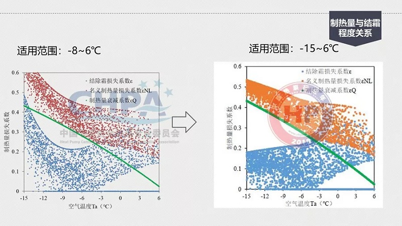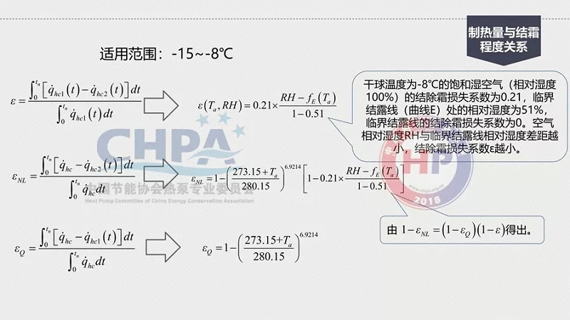 在-15℃到-8℃數學模式的圖上可以看到,結霜的損失系數用一個符號來代表,結霜的損失一定影響了它的名義制熱量,所以,它有一個損失系數,會影響到整個制熱量的衰減。有了數學模型就可用進行數學計算,去解決這樣的物理現象。
