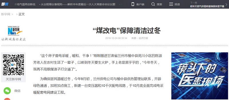 新華網(wǎng):空氣源熱泵,蓄熱式電鍋爐等“煤改電”設(shè)備保障清潔過冬